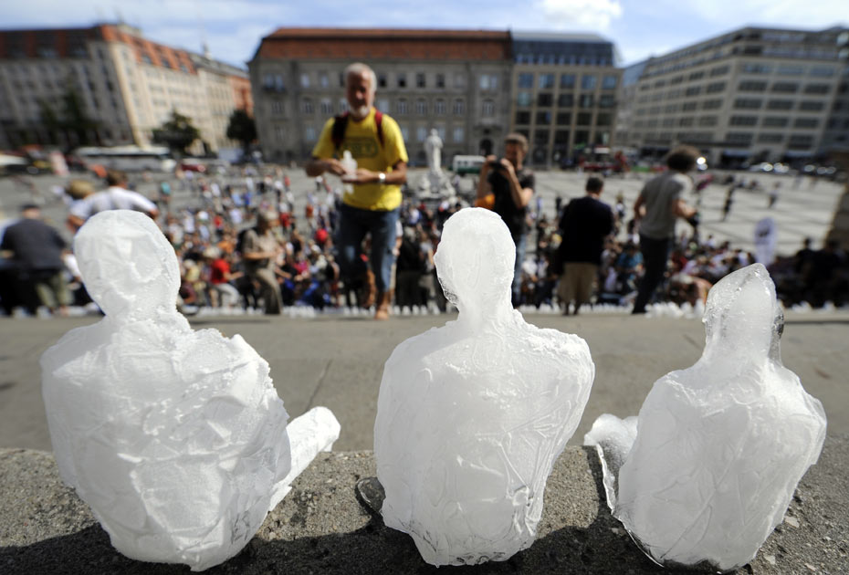 9月2日,德國柏林,世界野生動物基金會(WWF)將1000個小冰人被放置在了御林廣場音樂廳的臺階上,小冰人慢慢融化成水;顒拥慕M織者希望此舉能引起公眾對于全球變暖的關(guān)注。來源:中國新聞網(wǎng)