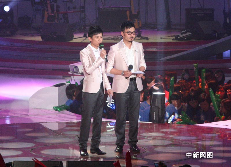 9月4日,湖南衛(wèi)視“2009快樂女聲”進(jìn)行最后的總決賽。江映蓉、黃英、李霄云這3強(qiáng)選手將通過18首歌曲的演繹,向全國(guó)總冠軍發(fā)起最后沖擊。圖為主持人何炅和汪涵。劉雙雙攝