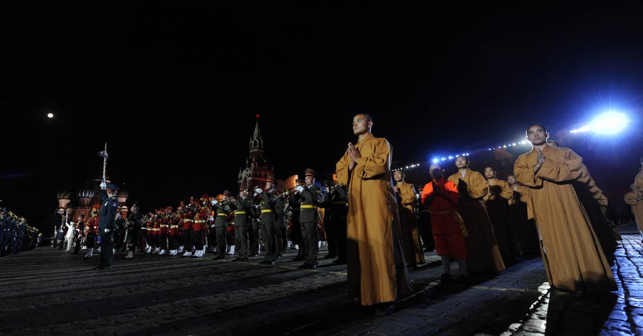 9月4日晚,在俄羅斯莫斯科紅場(chǎng)舉行的俄羅斯國(guó)際軍樂節(jié)開幕前夕的總彩排上,中國(guó)少林武僧亮相并進(jìn)行了精彩表演。
