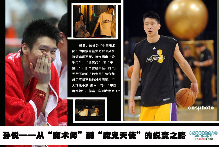 中新網(wǎng)本周熱點人物之——孫悅 近日,被譽為“中國魔術師”的國家男籃主力后衛(wèi)孫悅可謂麻煩不斷,接連爆出“分手門”、“偷笑門” 和“車震門”。那個曾經年輕、帥氣、無所不能的“孫大圣”如今卻成了不折不扣的緋聞明星。廣大球迷不禁 要問一句:“中國魔術師”,你這一年到底怎么了?圖片來源:中國新聞網(wǎng)