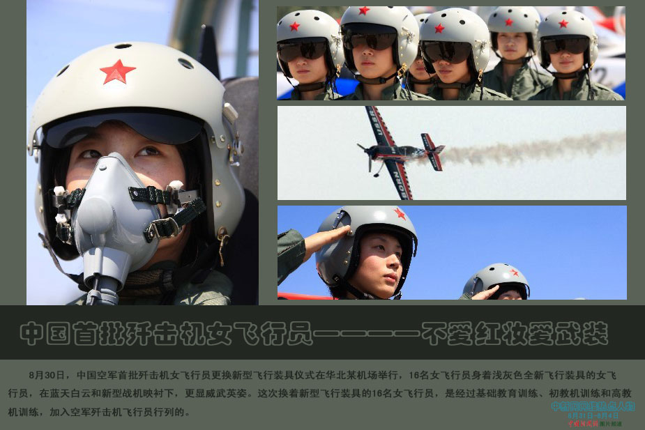中新網本周熱點人物之——中國首批殲擊機女飛行員 8月30日,中國空軍首批殲擊機女飛行員更換新型飛行裝具儀式在華北某機場舉行,16名女飛行員身著淺灰色全新飛行裝具的女飛行員,在藍天白云和新型戰(zhàn)機映襯下,更顯威武英姿。這次換著新型飛行裝具的16名女飛行員,是經過基礎教育訓練、初教機訓練和高教機訓練,加入空軍殲擊機飛行員行列的。來源:中國新聞網