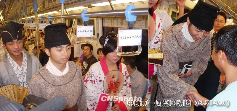 三日上午,三位身著古裝的年輕人在南京地鐵首列品牌列車“人文號(hào)”里,與乘客一起朗誦詩(shī)歌、知識(shí)競(jìng)答。圖片來(lái)源:中國(guó)新聞網(wǎng)