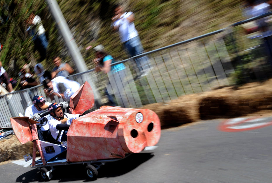 圖為參賽選手帶著自制的“豬頭”賽車參加比賽。