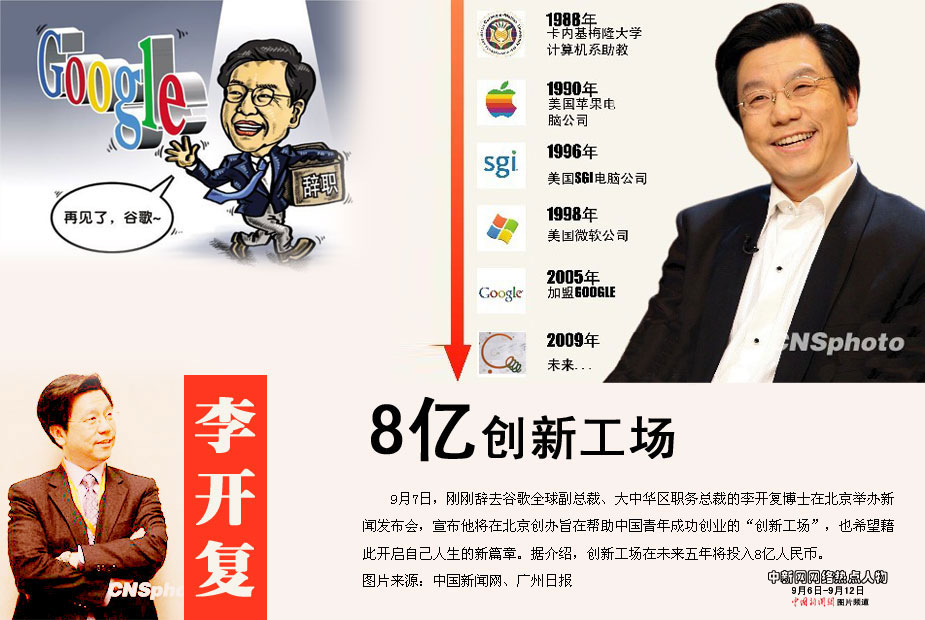 中新網(wǎng)本周熱點(diǎn)人物之——李開復(fù) 剛剛辭去谷歌全球副總裁、大中華區(qū)職務(wù)總裁的李開復(fù)博士在北京舉辦新聞發(fā)布會,宣布他將在北京創(chuàng)辦旨在幫助中國青年成功創(chuàng)業(yè)的“創(chuàng)新工場”,也希望藉此開啟自己人生的新篇章。據(jù)介紹,創(chuàng)新工場在未來五年將投入8億人民幣。