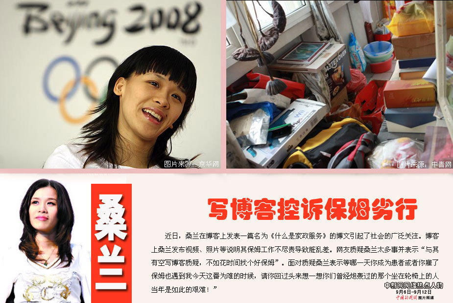 中新網(wǎng)本周熱點人物之——桑蘭 近日,桑蘭在博客上發(fā)表一篇名為《什么是家政服務(wù)》的博文引起了社會的廣泛關(guān)注。博客上桑蘭發(fā)布視頻、照片等說明其保姆工作不盡責(zé)導(dǎo)致臟亂差。有網(wǎng)友質(zhì)疑桑蘭太多事并表示“與其有空寫博客質(zhì)疑,不如花時間找個好保姆”。面對質(zhì)疑桑蘭稱“別以為‘輪椅事件’ ‘神醫(yī)門’‘保姆門’就認為我是個怨婦或者那么唧唧歪歪。等哪一天你坐上輪椅乘飛機,你成為患者或者你雇了保姆也遇到我今天這番為難的時候,請你回過頭來想一想你們曾經(jīng)炮轟過的那個坐在輪椅上的人當(dāng)年是如此的艱難!”
