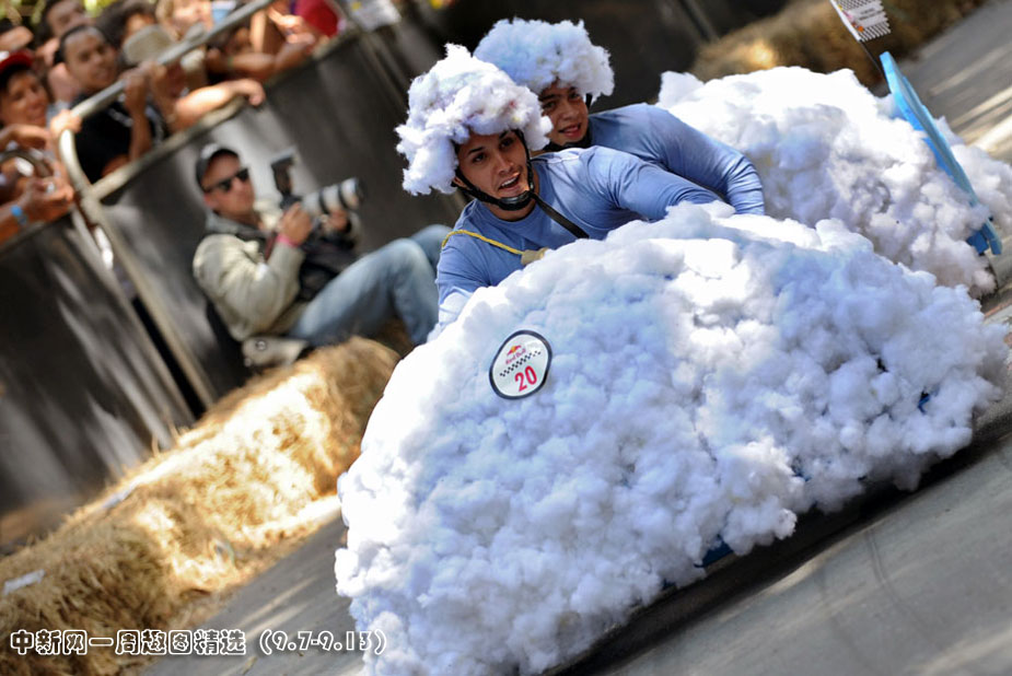 9月6日,哥倫比亞麥德林市舉行了一場別開生面的小汽車競賽,參賽選手帶著各自設(shè)計的奇形怪狀的“賽車”前來參加比賽。圖片來源:中國新聞網(wǎng)