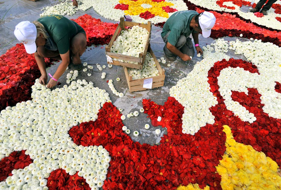 據(jù)悉,原本計劃全部使用以色列的鮮花,但由于當?shù)氐孽r花產(chǎn)量不足,只能從布魯塞爾進口,這批鮮花每朵花的直徑都在20厘米左右。百名志愿者們費時7小時精心鋪成了這張花毯,這張鮮花地毯將展示三天,隨后將被生態(tài)埋葬。