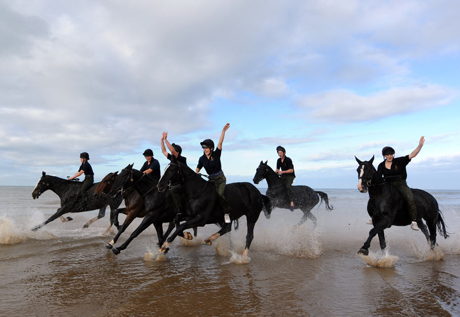 9月16日,英國(guó)皇家騎兵團(tuán)在英格蘭黑池附近的海水中暢游。在日常儀式職責(zé)之余,騎兵團(tuán)帶著馬匹來(lái)這里放松休息。圖片來(lái)源:中國(guó)新聞網(wǎng)