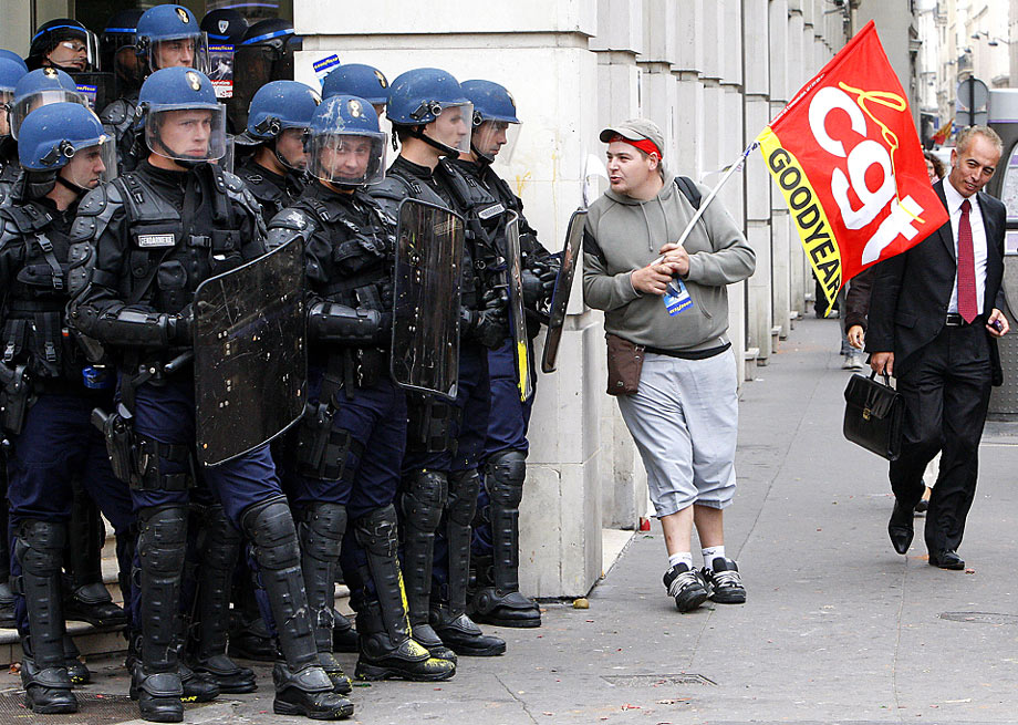 9月17日,在巴黎的金融市場管理局總部前,一名固特異公司雇員與保衛(wèi)總部大樓的防暴警察面對面。當天,數(shù)百人舉行抗議反對汽車制造業(yè)裁員和重組。圖片來源:中國新聞網(wǎng)