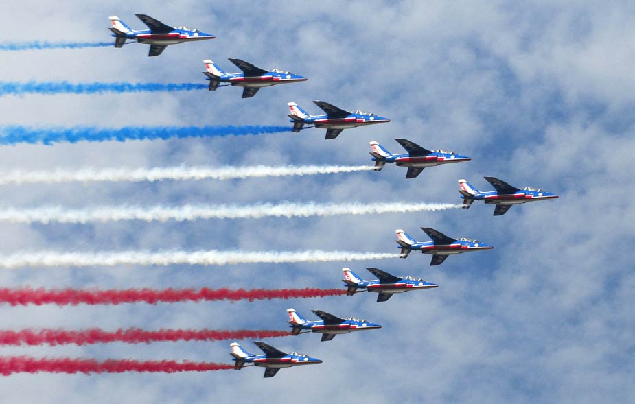9月19日,智利首都圣地亞哥舉行了盛大閱兵式慶祝獨(dú)立199周年。圖為法國(guó)特技飛行表演隊(duì)“法蘭西巡邏兵”在閱兵儀式上進(jìn)行表演。