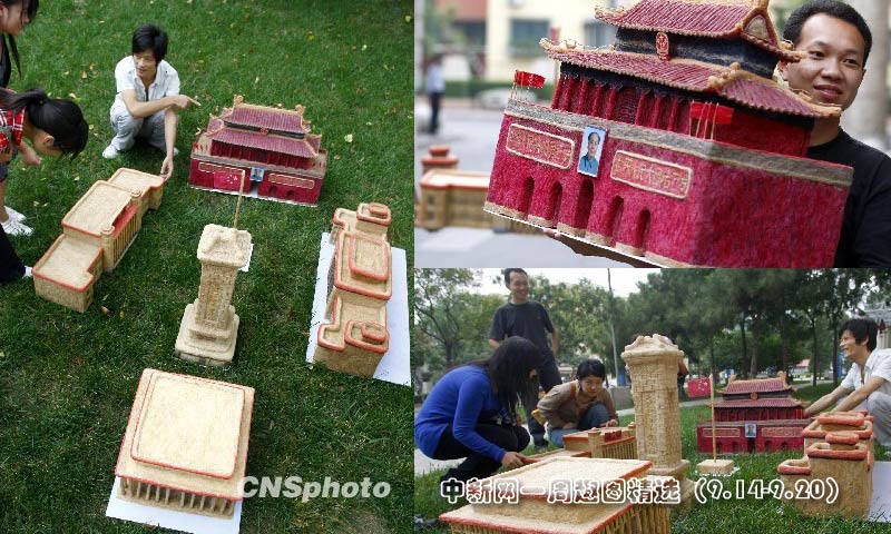 為迎接祖國60華誕,四川青年理發(fā)師黃鑫用40多公斤碎頭發(fā)制作了一個微型“天安門廣場”全景模型。圖片來源:中國新聞網(wǎng)