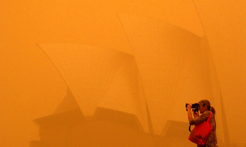 澳大利亞悉尼23日出現(xiàn)罕見的沙塵暴,加上風(fēng)速每小時上百公里的強(qiáng)風(fēng)吹襲,全城籠罩在一片橘紅色的塵霧中,由于能見度相當(dāng)?shù),飛機(jī)和渡輪暫時停飛或停駛。