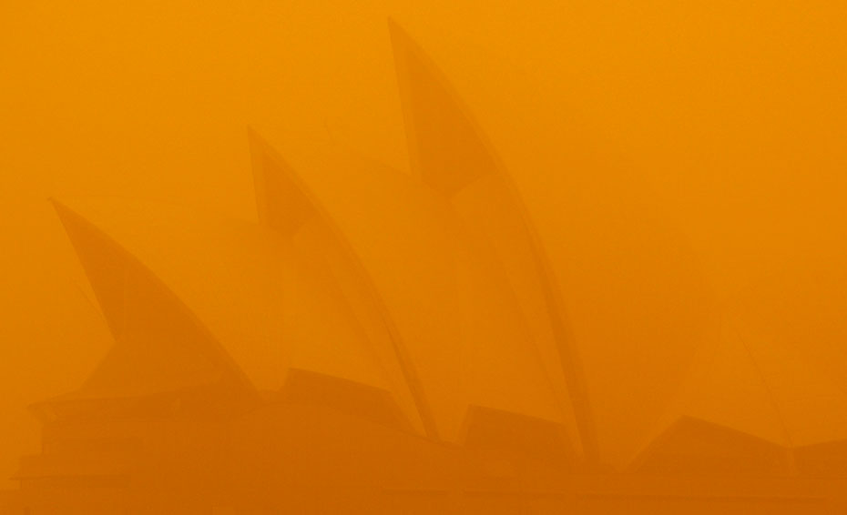 澳大利亞悉尼23日出現(xiàn)罕見的沙塵暴,加上風(fēng)速每小時(shí)上百公里的強(qiáng)風(fēng)吹襲,全城籠罩在一片橘紅色的塵霧中,由于能見度相當(dāng)?shù),飛機(jī)和渡輪暫時(shí)停飛或停駛。