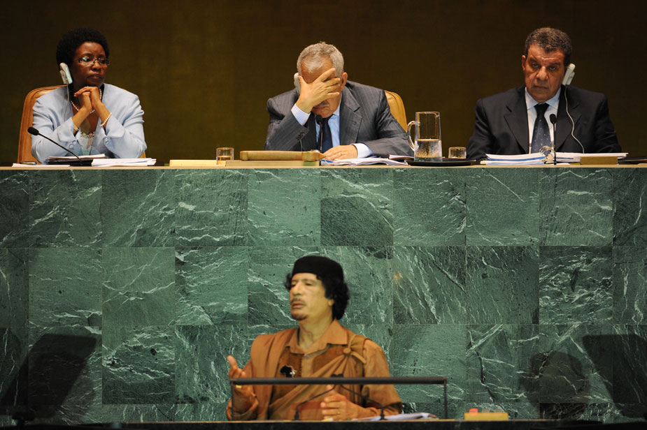 執(zhí)政40年來(lái)首次在聯(lián)合國(guó)亮相的利比亞領(lǐng)導(dǎo)人卡扎菲,23日在聯(lián)大一般性辯論上發(fā)表演講,強(qiáng)力攻擊安理會(huì)和聯(lián)合國(guó)的現(xiàn)有體制,并將原定15分鐘的演講拖到一個(gè)半小時(shí),很多國(guó)家代表團(tuán)成員最后堅(jiān)持不住,紛紛離開(kāi)會(huì)議現(xiàn)場(chǎng)。圖片來(lái)源:中國(guó)新聞網(wǎng)