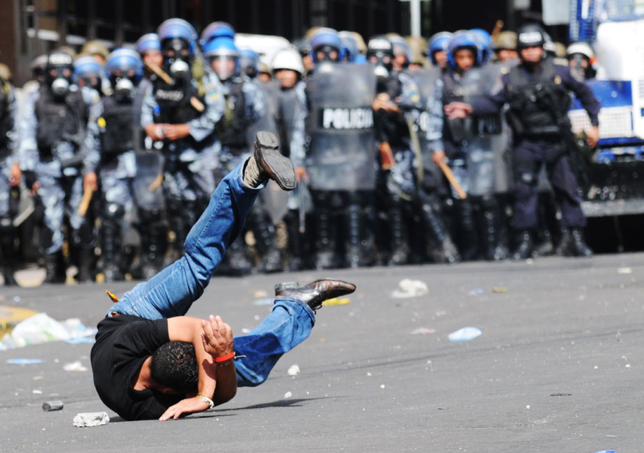 23日,在洪都拉斯首都特古西加爾巴,一名抗議者被警察的橡膠子彈擊中。洪都拉斯警方發(fā)言人奧爾林·塞拉托當(dāng)日表示,自21日被罷免總統(tǒng)塞拉亞突然回國以來,洪首都特古西加爾巴局部地區(qū)發(fā)生多次騷亂,已經(jīng)造成兩人喪生。圖片來源:中國新聞網(wǎng)