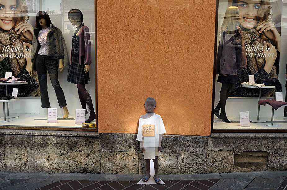 在斯洛文尼亞的盧布爾雅那街頭,聯(lián)合國兒童基金會放置了一個小乞丐的圖片紙板,以引起人們關(guān)注那些身處困境的盧旺達兒童。圖片來源:中國新聞網(wǎng)