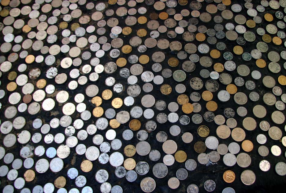 扎什倫布寺里的一處圣跡,即高僧大德觸摸或者蒞臨過的地方。墻上抹過酥油,有了粘性,信徒朝拜路過時會粘貼銀幣于其上,有如在廟堂敬獻錢幣。