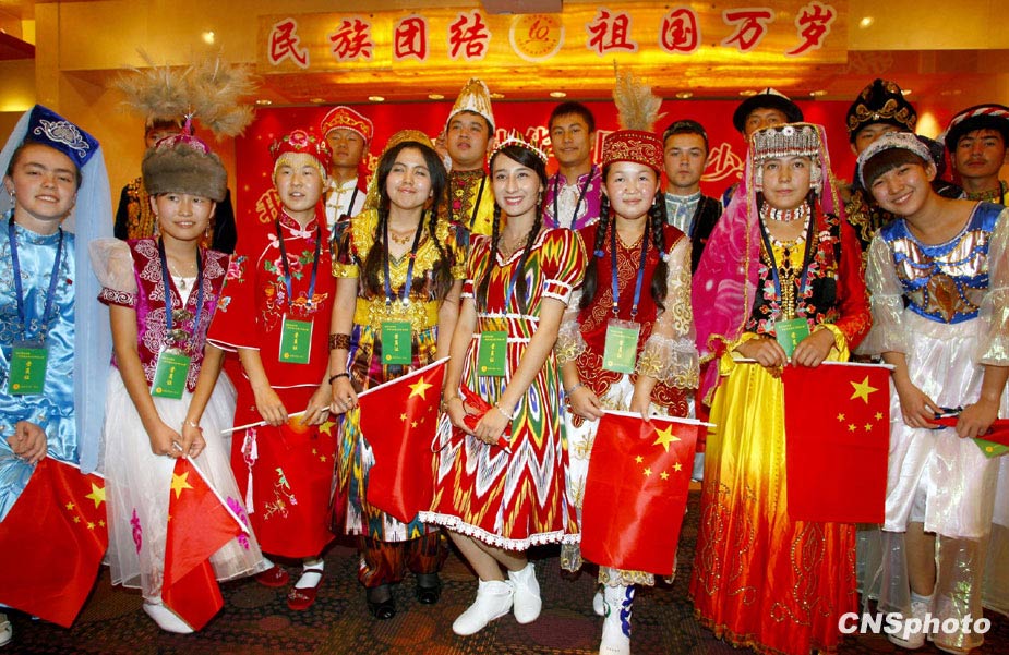 9月24日晚,“我愛(ài)我的祖國(guó)——中華各民族青少年同心營(yíng)”在北京開(kāi)營(yíng)。本次同心營(yíng)活動(dòng)從全國(guó)56個(gè)民族中挑選男女各一名優(yōu)秀學(xué)生代表共計(jì)112人進(jìn)京參加,在北京期間,營(yíng)員們不僅將與北京少先隊(duì)員一起繡國(guó)旗,國(guó)慶當(dāng)天,他們將穿上本民族的服飾,組成“國(guó)旗禮儀隊(duì)”,簇?fù)碓谔彀查T(mén)廣場(chǎng)國(guó)旗旗桿下,代表56個(gè)民族的青少年共迎國(guó)旗。中新社發(fā) 鄭雄增 攝