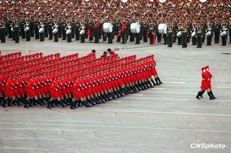 國慶50周年閱兵的女民兵方隊(duì)經(jīng)過天安門廣場。中新社發(fā)
