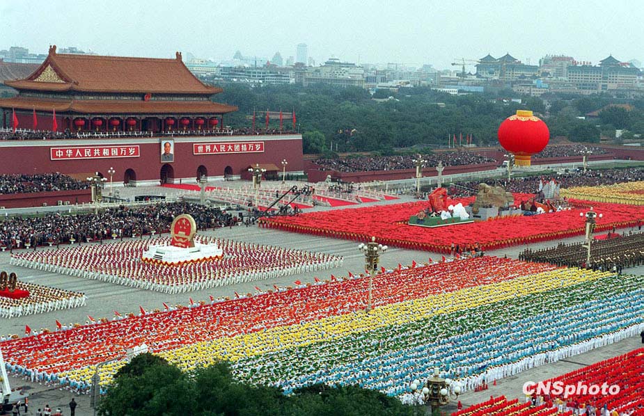 圖為參加1999年國(guó)慶慶典的群眾游行方陣和背景組字隊(duì)伍在天安門(mén)廣場(chǎng)上形成鮮艷的色塊效果。 中新社發(fā) 任晨鳴 攝