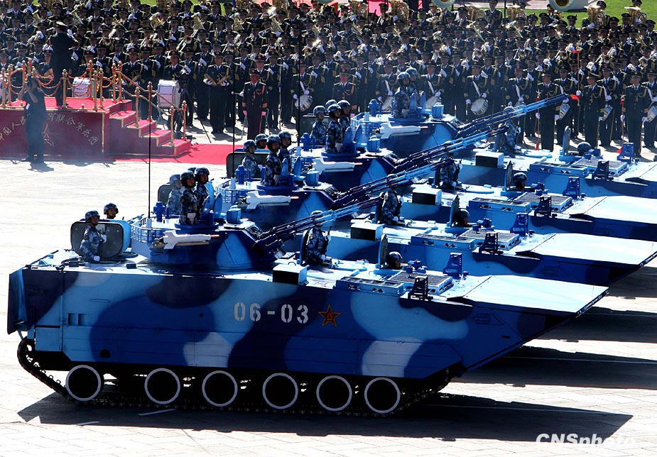 10月1日,中華人民共和國成立60周年慶祝大會(huì)在北京天安門地區(qū)及長安街沿線舉行。圖為海軍05式兩棲步戰(zhàn)車方隊(duì)通過天安門廣場(chǎng)。首次亮相的05式兩棲步戰(zhàn)車是海軍陸戰(zhàn)隊(duì)新一代主戰(zhàn)裝備,信息化程度較高,安裝了先進(jìn)的火控系統(tǒng)、衛(wèi)星定位系統(tǒng)、夜視系統(tǒng)、一體化通訊系統(tǒng)等。同時(shí),步戰(zhàn)車火力系統(tǒng)得到全面提升,裝備了反坦克導(dǎo)彈、速射炮和高射機(jī)槍,能有效應(yīng)對(duì)來自坦克和直升機(jī)的威脅。中新社發(fā) 任晨鳴 攝