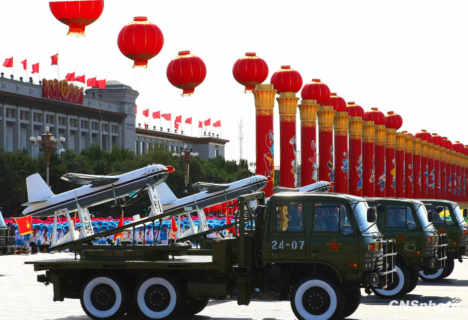 2009年10月1日,中華人民共和國(guó)成立60周年慶祝大會(huì)在北京天安門(mén)廣場(chǎng)舉行。圖為無(wú)人機(jī)方隊(duì)接受檢閱。中新社發(fā) 宋吉河 攝