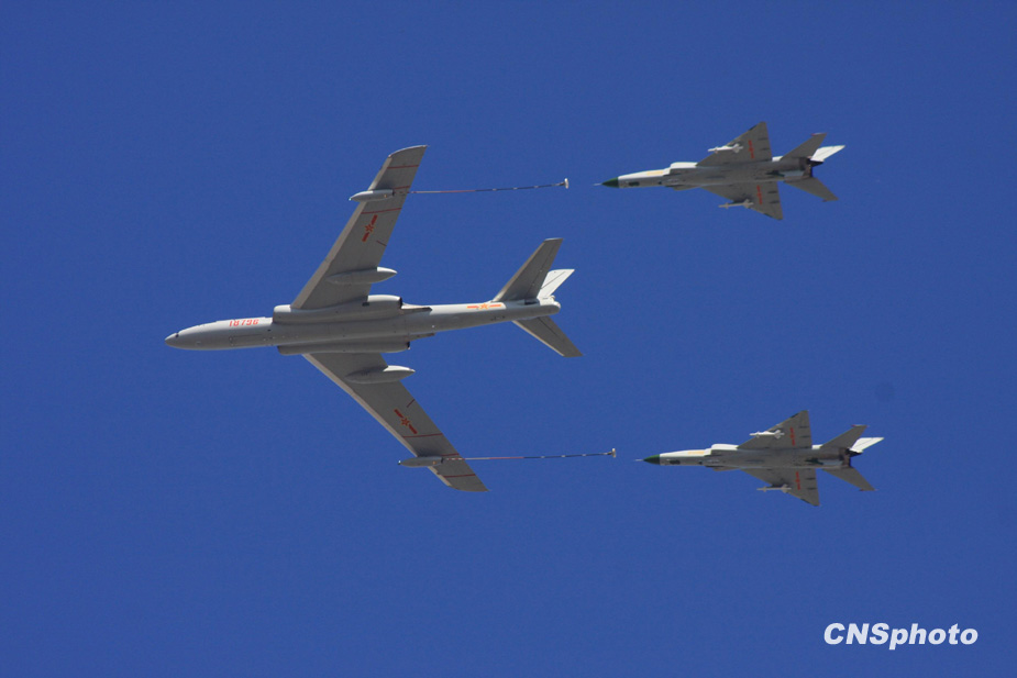 2009年10月1日,中華人民共和國成立60周年慶祝大會(huì)在北京天安門廣場(chǎng)舉行。圖為加受油機(jī)梯隊(duì)通過天安門廣場(chǎng)上空。中新社發(fā) 郭國權(quán) 攝