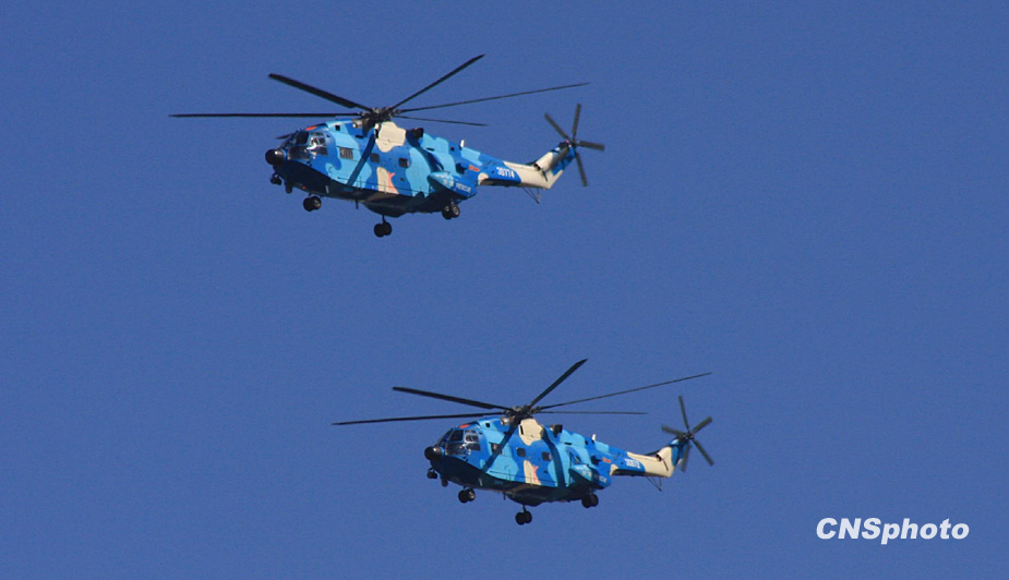 2009年10月1日,中華人民共和國成立60周年慶祝大會在北京天安門廣場舉行。圖為搜救、運輸直升機梯隊。中新社發(fā) 郭國權(quán) 攝