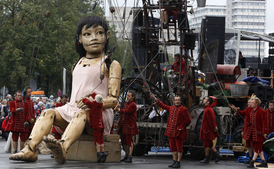 10月2日,來自法國一家戲劇公司的兩個巨型提線木偶亮相柏林街頭,它們將在露天劇場進(jìn)行表演,以此紀(jì)念柏林墻推倒20周年。