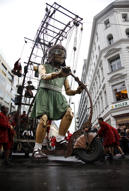10月2日,來(lái)自法國(guó)一家戲劇公司的兩個(gè)巨型提線(xiàn)木偶亮相柏林街頭,它們將在露天劇場(chǎng)進(jìn)行表演,以此紀(jì)念柏林墻推倒20周年。