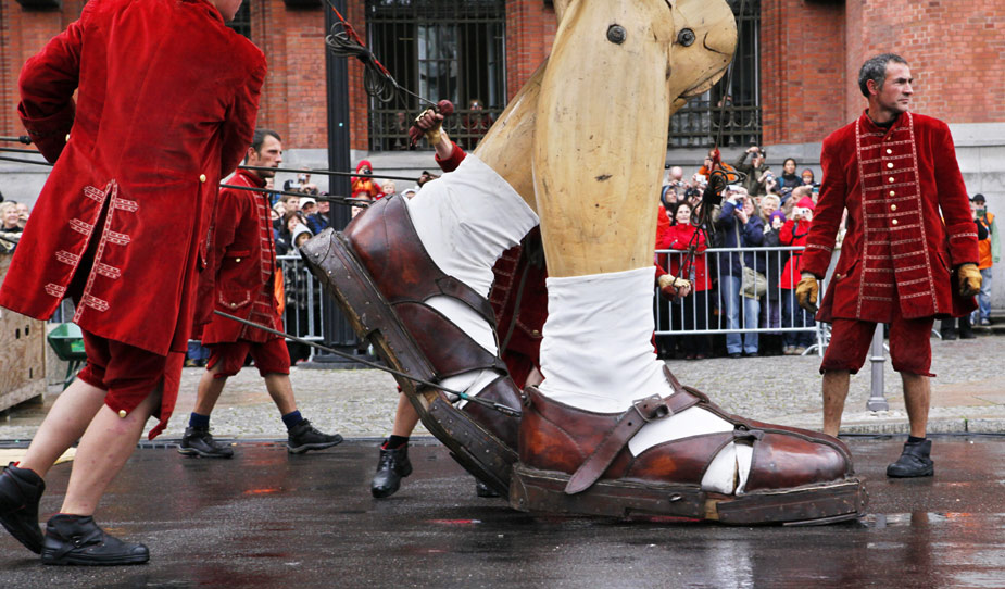 10月2日,來(lái)自法國(guó)一家戲劇公司的兩個(gè)巨型提線木偶亮相柏林街頭,它們將在露天劇場(chǎng)進(jìn)行表演,以此紀(jì)念柏林墻推倒20周年。