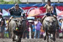 10月3日,泰國(guó)一年一度的騎水牛大賽在春武里舉行。