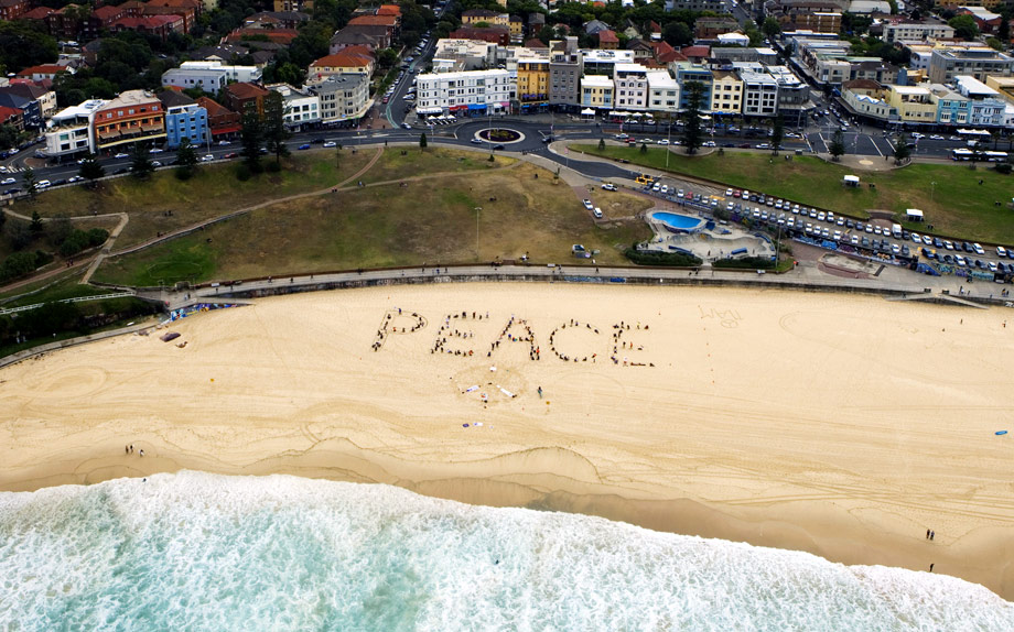 10月4日,一個在全球范圍內(nèi)祈求和平的活動在多個國家展開,呼吁結(jié)束戰(zhàn)爭、消除核武器和結(jié)束各種暴力行為。在澳大利亞悉尼附近的海灘上,參加和平游行的人組成和平圖案。來源:中國新聞網(wǎng)