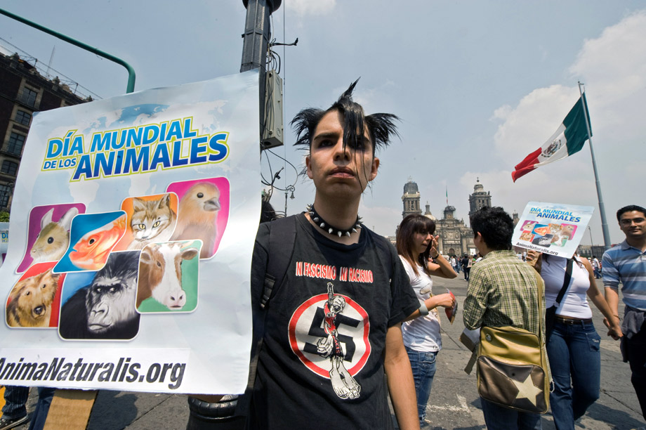 10月4日,在墨西哥首都墨西哥城,參加世界動(dòng)物日活動(dòng)的人們頭帶面具,手舉圖片,呼吁人們關(guān)注動(dòng)物權(quán)益。來源:中國新聞網(wǎng)