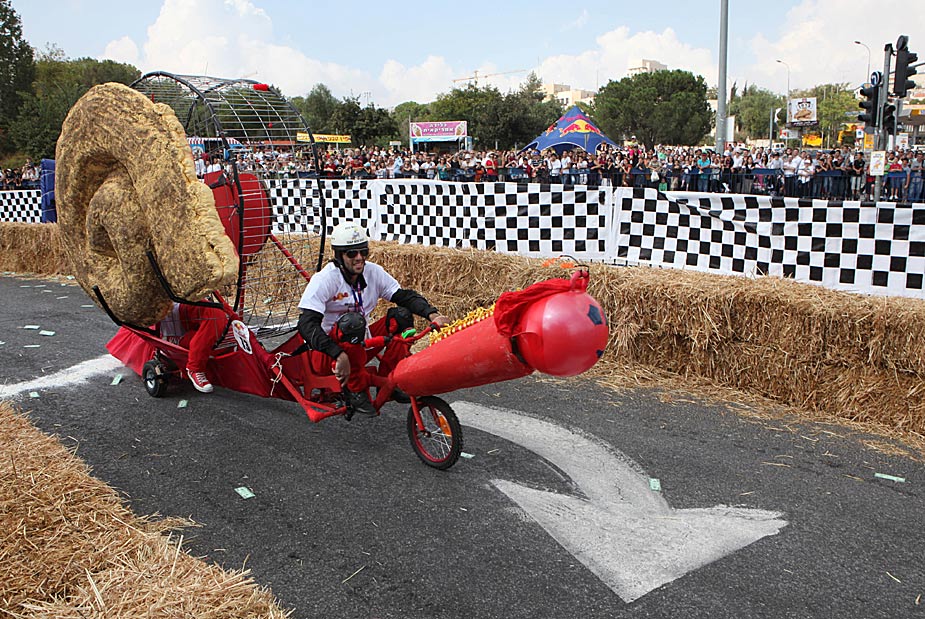 50輛“肥皂盒車”10月7日參加了耶路撒冷舉行的“肥皂盒車”趣味競賽。賽道設(shè)置在市中心一條大街的一段斜坡上,比賽者駕駛各種千奇百怪的賽車從起點一路滑下。圖片來源:中國新聞網(wǎng)