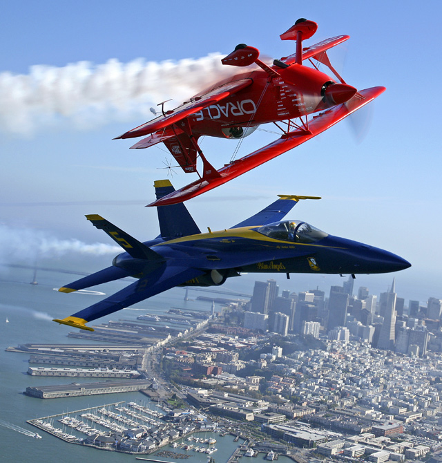 2009年10月8日,美軍飛機(jī)在舊金山灣上空進(jìn)行飛行演練。一年一度的舊金山艦隊(duì)周將于10月10日開幕,屆時(shí)會(huì)有船艦游行和飛行表演等活動(dòng)。 來源:中國新聞網(wǎng)