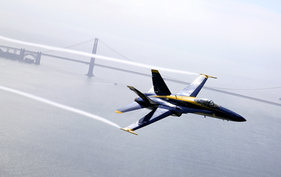 2009年10月8日,美軍飛機在舊金山灣上空進(jìn)行飛行演練。一年一度的舊金山艦隊周將于10月10日開幕,屆時會有船艦游行和飛行表演等活動。 來源:中國新聞網(wǎng)