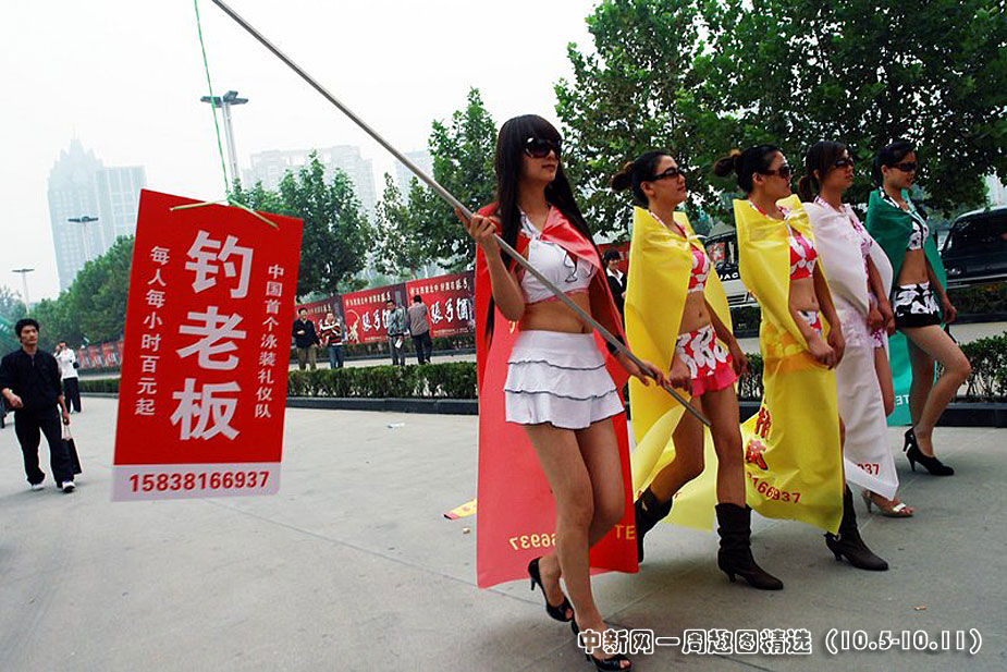10月9日,鄭州國(guó)際會(huì)展中心附近5名身穿性感泳裝的美女模特,在這里釣起“老板”。來(lái)源:CFP
