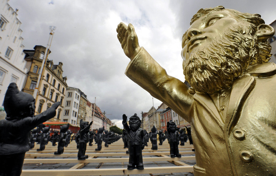 10月14日,德國施特勞賓市街頭擺放了1250個行納粹禮的花園土地神像,“行納粹禮的花園土地神”其實是一款雕塑作品,是由59歲的德國藝術(shù)家奧特馬爾·赫勒爾創(chuàng)作的目的在于提醒人們警惕法西斯思想,反對使用法西斯思想控制大眾。