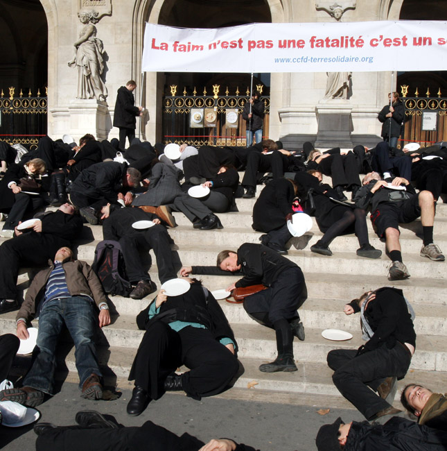 10月15日,示威者身穿黑色衣服、手持空盤子在巴黎歌劇院前抗議。他們此舉是為了呼吁人們關注世界上的饑民。圖片來源:中國新聞網