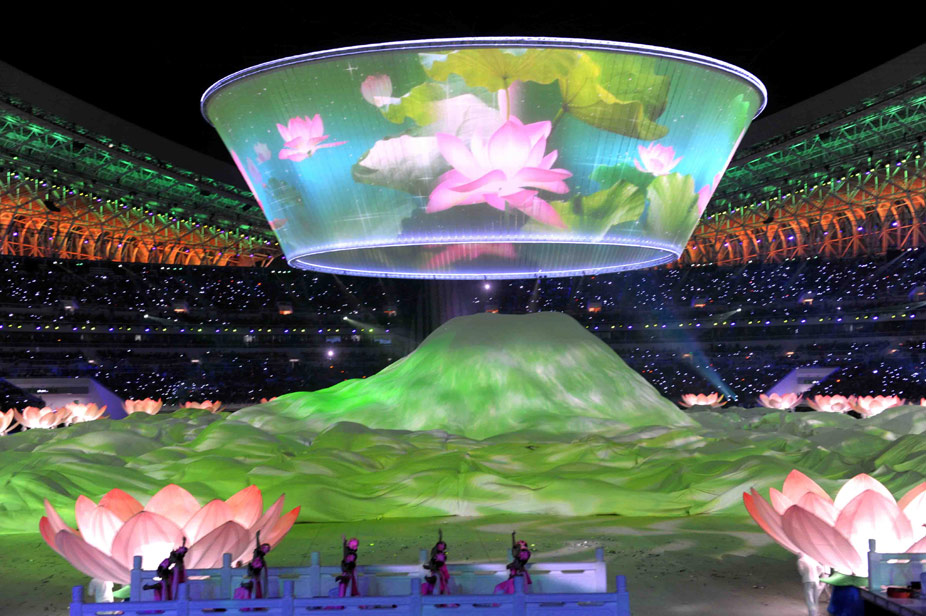 十月十六日晚,中華人民共和國(guó)第十一屆運(yùn)動(dòng)會(huì)在山東濟(jì)南奧體中心隆重開幕。圖為文藝晚會(huì)上的“巨碗”視頻演繹和平、和諧。中新社發(fā) 陳文 攝