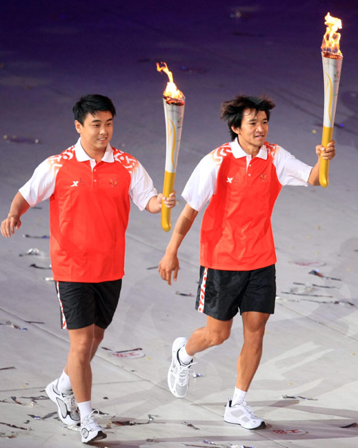 十月十六日晚,中華人民共和國第十一屆運(yùn)動(dòng)會(huì)在山東濟(jì)南奧體中心隆重開幕。王皓、香港運(yùn)動(dòng)員黃金寶(右)與眾火炬手一起點(diǎn)燃全運(yùn)圣火。中新社發(fā) 湯彥俊 攝