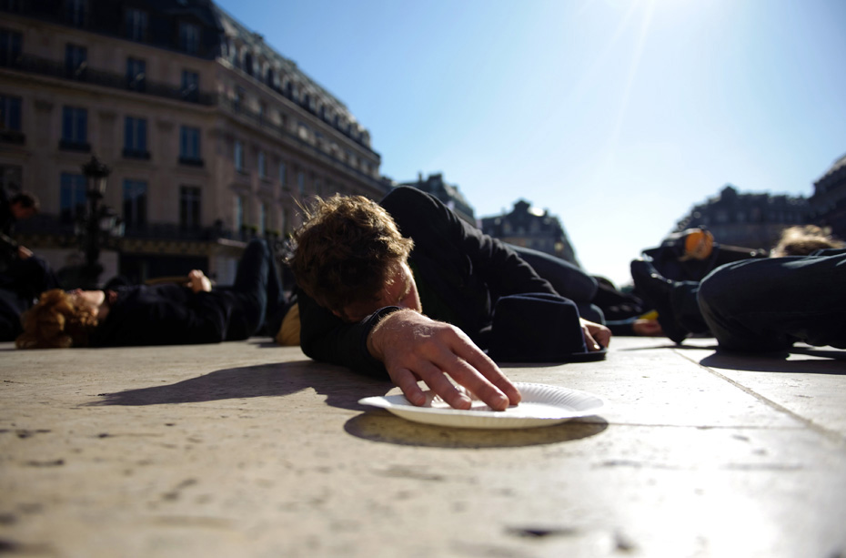 周四(10月15日),示威者身穿黑色衣服、手持空盤子在巴黎歌劇院前抗議。他們此舉是為了呼吁人們關(guān)注世界上的饑民!10月16日是世界糧食日,今年的主題是“應(yīng)對危機(jī),實(shí)現(xiàn)糧食安全”。 圖片來源:中國新聞網(wǎng)