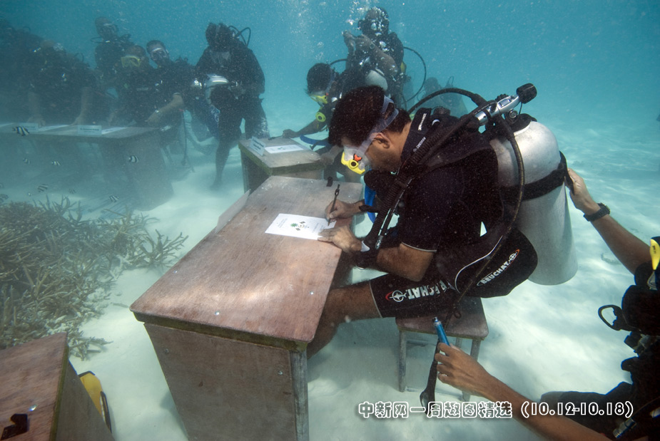 10月17日,印度洋島國馬爾代夫首次在水下召開內(nèi)閣會(huì)議。圖片來源:中國新聞網(wǎng)