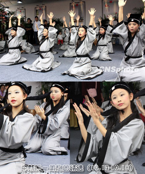 10月15日,2009年湖北宜昌秋季房地產(chǎn)交易會開幕,一家房地產(chǎn)公司還請來小學(xué)生現(xiàn)場進(jìn)行國學(xué)表演,吟唱“三字經(jīng)”,為房交會增添文化氣息。圖片來源:中國新聞網(wǎng)