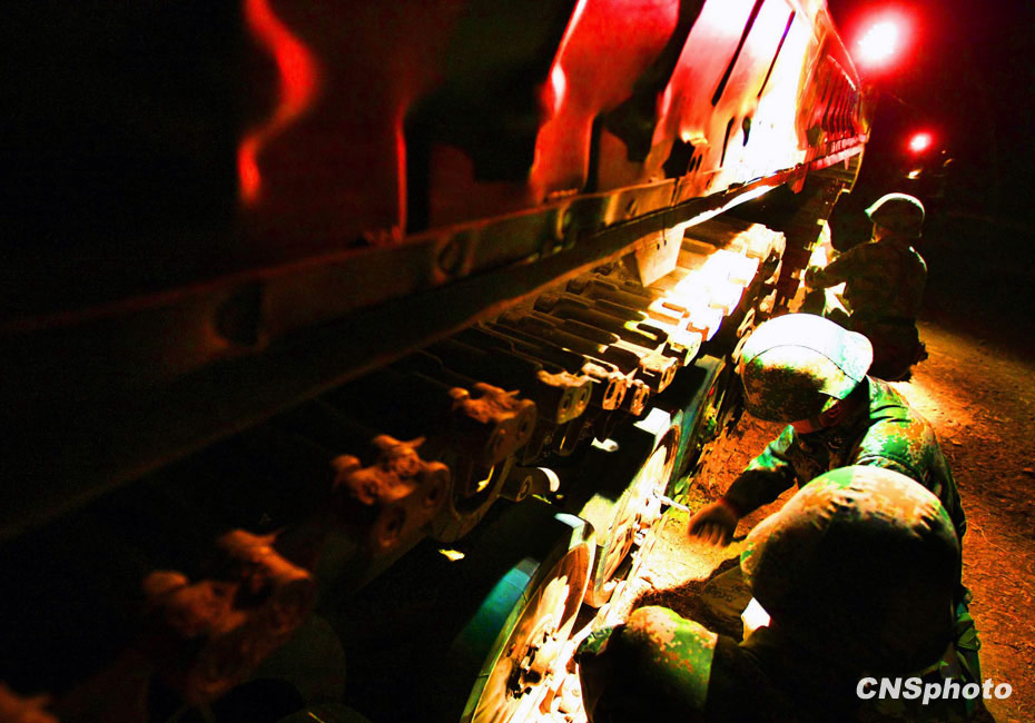 當(dāng)晚國防大學(xué)防務(wù)學(xué)院、空軍指揮學(xué)院的外軍學(xué)員,以及英國、以色列、土耳其、巴基斯坦等國軍事觀察員親臨現(xiàn)場觀摩了后勤保障戰(zhàn)斗準(zhǔn)備、自行榴彈炮占領(lǐng)陣地、裝甲車輛“摸黑”開進(jìn)等戰(zhàn)斗要素。圖為后勤保障基地?fù)屝扪b甲戰(zhàn)車。中新社發(fā) 宋吉河 攝