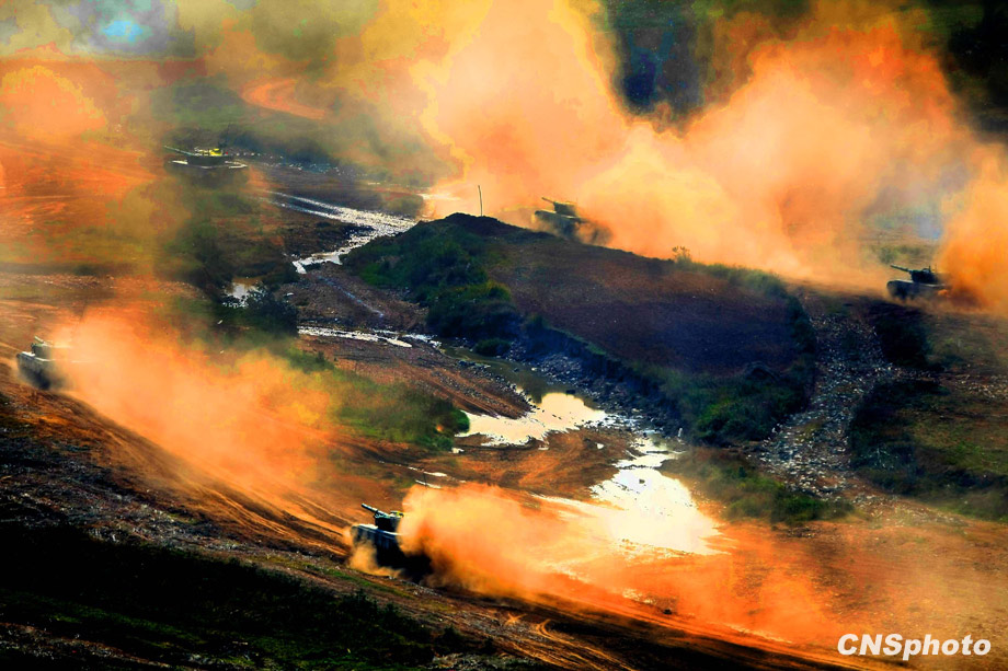 解放軍“前鋒-二00九A”演習(xí),二十二日在濟(jì)南軍區(qū)某合同戰(zhàn)術(shù)訓(xùn)練基地進(jìn)行陸空聯(lián)合火力打擊實兵實彈演練。中新社發(fā) 宋吉河 攝