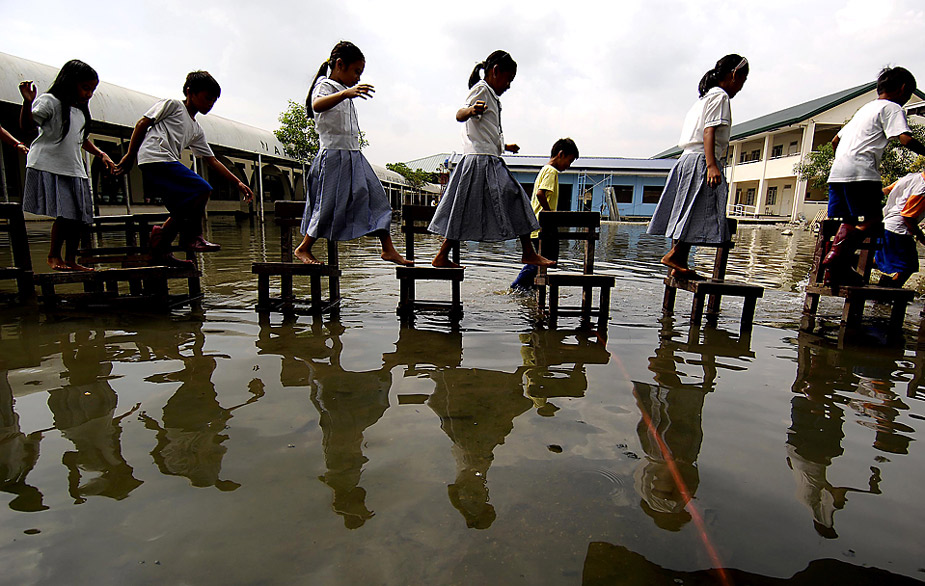 周二(20日)在菲律賓黎剎省,孩子們踩著椅子走過(guò)被洪水淹沒的學(xué)校操場(chǎng)。臺(tái)風(fēng)“盧碧”給飽受暴雨侵襲的菲律賓北部地區(qū)帶來(lái)更為強(qiáng)烈的降水。 來(lái)源:中國(guó)新聞網(wǎng)
