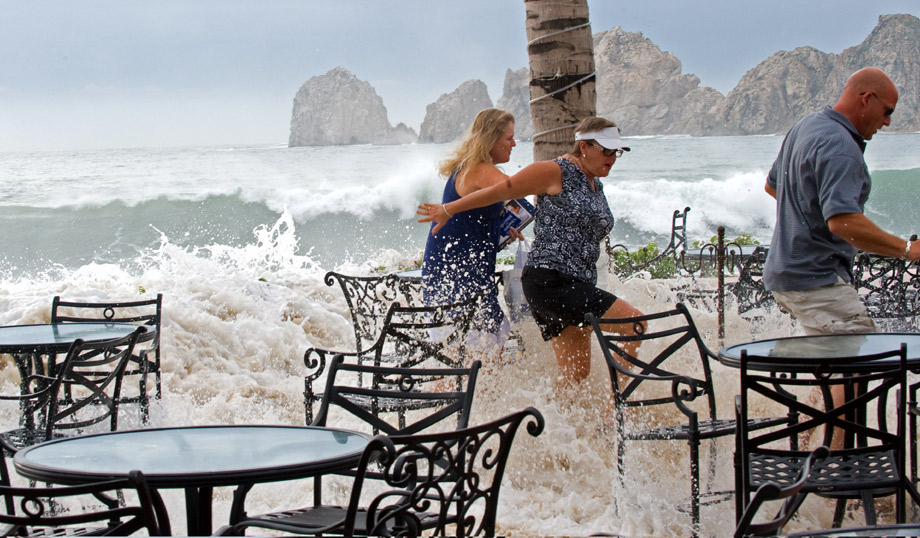 當(dāng)?shù)貢r間10月19日,墨西哥圣盧卡斯角,颶風(fēng)里克已經(jīng)在墨西哥沿海升級為10年來威力最強的颶風(fēng)。圖為游客被海邊的巨浪趕跑。