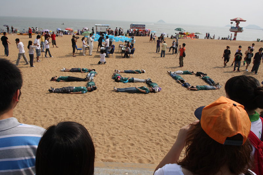 2009年10月24日,當(dāng)日是350全球應(yīng)對(duì)氣候變化行動(dòng)日,世界各地的民眾紛紛用自己的方式來表示對(duì)全球氣候變化的關(guān)注和擔(dān)憂。圖為中國(guó)廣東珠海海濱泳場(chǎng),大學(xué)生進(jìn)行海灘辦公的行為藝術(shù)。鐘凡 攝